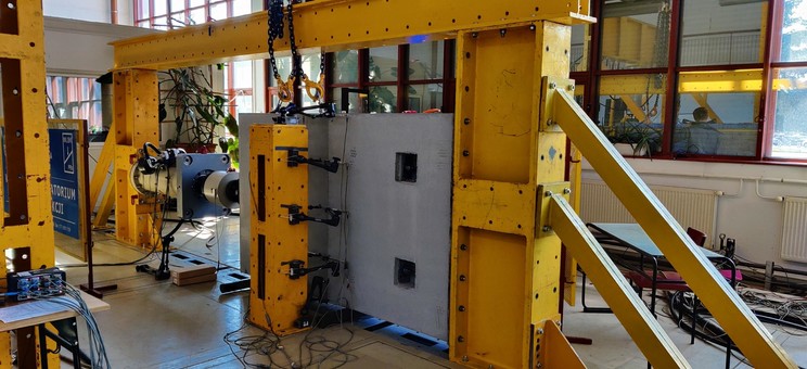 W Laboratorium przeprowadzono badanie nośności łączników przeznaczonych do bezspoinowego połączenia prefabrykowanych elementów zbiornika cylindrycznego o średnicy 10m i wysokości 6m. W trakcie badań realizowane były pomiary rozwarcia szczeliny między elementami prefabrykowanymi z wykorzystaniem czujników indukcyjnych. Badania były wspomagane systemem optycznym do pomiaru odkształceń ARAMIS.