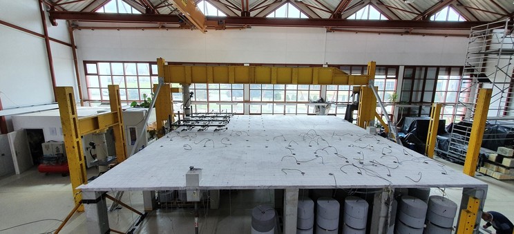 Przedmiotem badań był strop żelbetowy o wymiarach 0,08 m x 9,6 m x 9,6 m, oparty na 25 prefabrykowanych słupach. W czasie badań usuwano trzy słupy krawędziowe i jeden wewnętrzny. Obciążenia były zadawane za pomocą obciążników betonowych oraz siłownika hydraulicznego. Wykorzystywano standardowe i najnowsze techniki pomiarowe, w tym tensometry światłowodowe oraz system optyczny do trójwymiarowego pomiaru odkształceń ARAMIS.