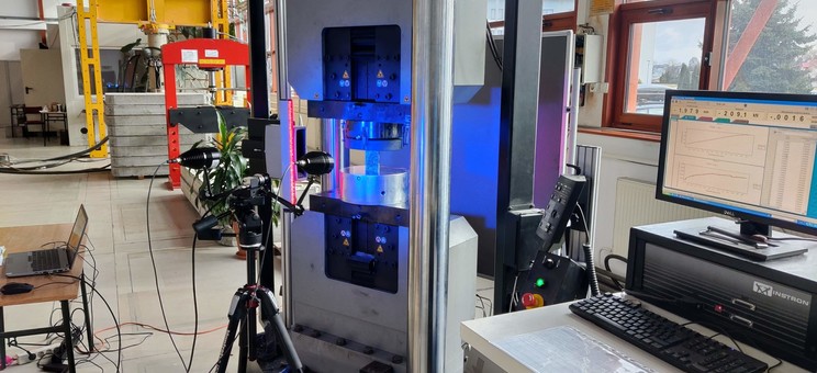 W czasie badań prowadzone były pomiary odkształceń z wykorzystaniem ekstensometru video, pomiary tensometryczne oraz pomiary odkształceń za pomocą systemu optycznego ARAMIS.