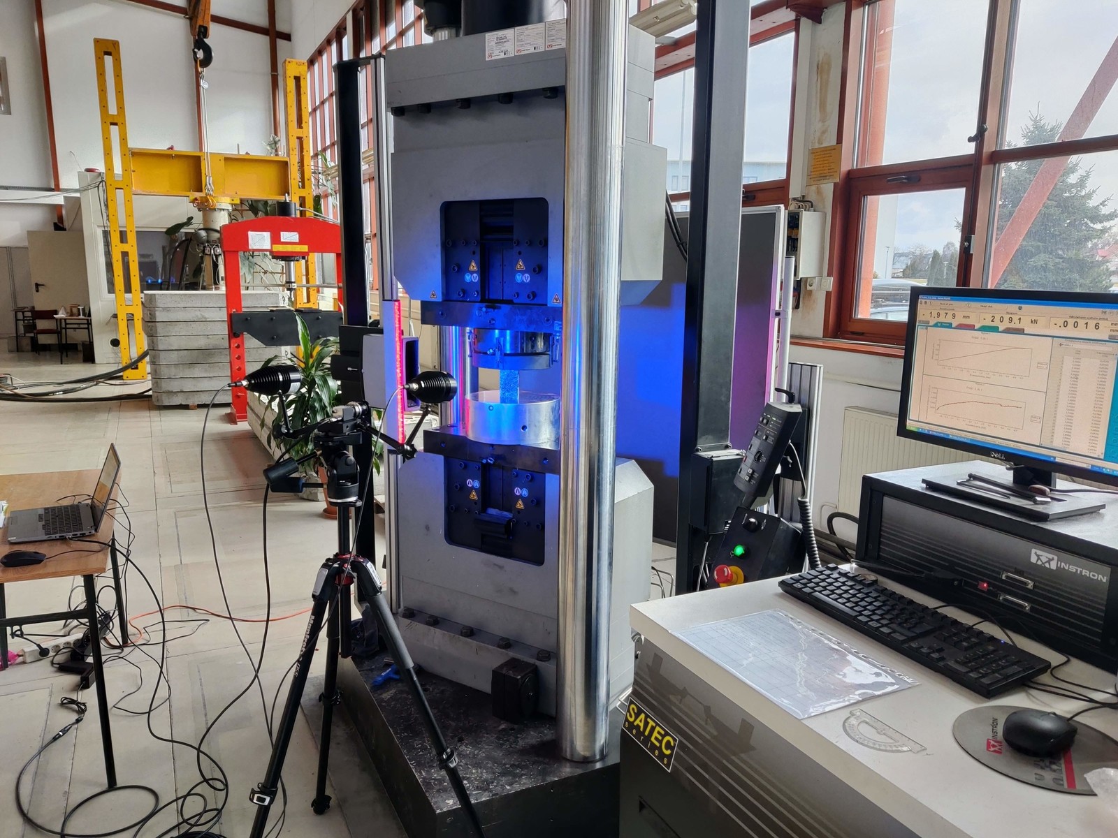 Badania wytrzymałości na ściskanie króćców stalowych na maszynie wytrzymałościowej Instron 1200kN - praca badawcza Katedry Konstrukcji Budowlanych.